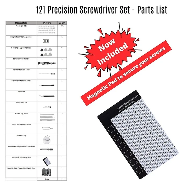 A wide selection of 121 in 1 screwdriver kit.It can be used for electronics, mobile phone, android phone, watch, glasses, laptop, Jewelers and home appliances such as televisions, air conditioners, etc.We have also prepared three special impact driver bits T6, T8 and T10 hollow plum, available for repairing game machine.This tool kit can really satisfy your daily needs.Precision screwdriver set with a professional storage case and micro magnetic pad]This mini screwdriver set is equipped with a plastic storage box that is shockproof.The arrangement is designed accordingly, the card position is consistent and the items are stuck.In addition, a magnetic pad is equipped, which is used for collecting small screws, avoid the screws missing.Perfectly eliminating the possibility of missing screws, which is the another reason for you to choose this item.Electronic screwdriver available for home improvement accessories.Available in soft and hard extensions for narrow corners.