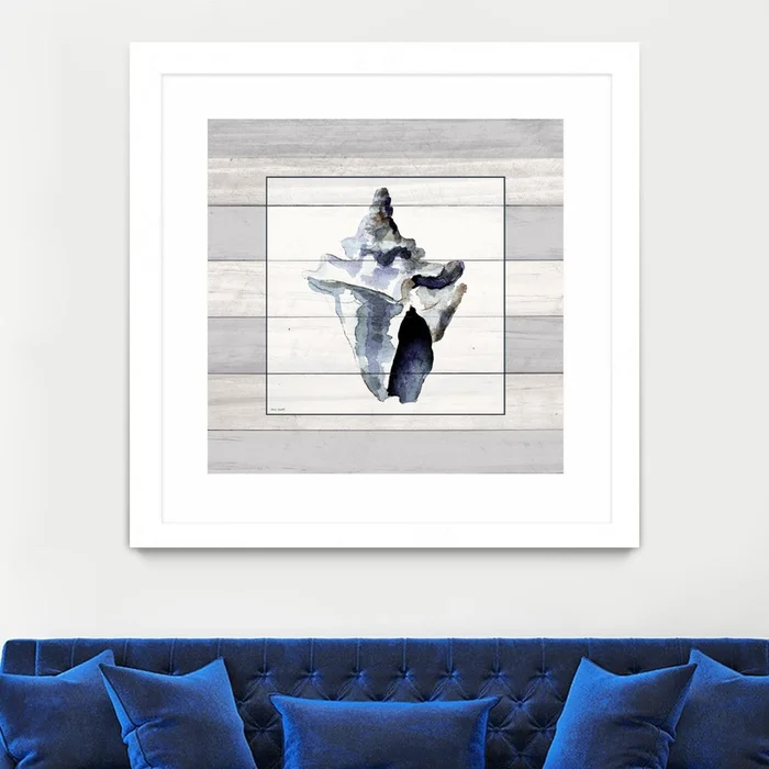 Muted Blue Sea Conch On Wood Matted and Framed White 36×36 Wall Art|uvre dart murale encadre blanche et mate Muted Blue Sea Conch On Wood 36×36