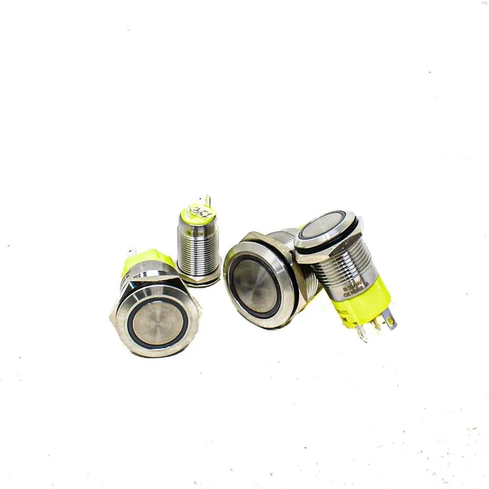 These metal push buttons are a very tough, small, panel-mount switch with an illuminated Yellow LED ring.